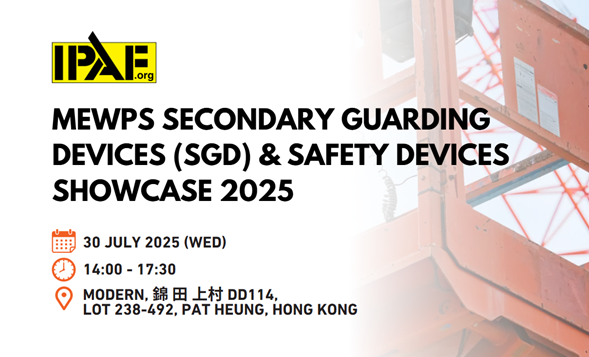 The IPAF Hong Kong Webinar 2022 will take place virtually on 14th October 2022 from 12pm - 1.30pm (GMT+8) focusing on secondary guarding devices to enhance the safe use of MEWPs in the region. The webinar will be conducted in English.